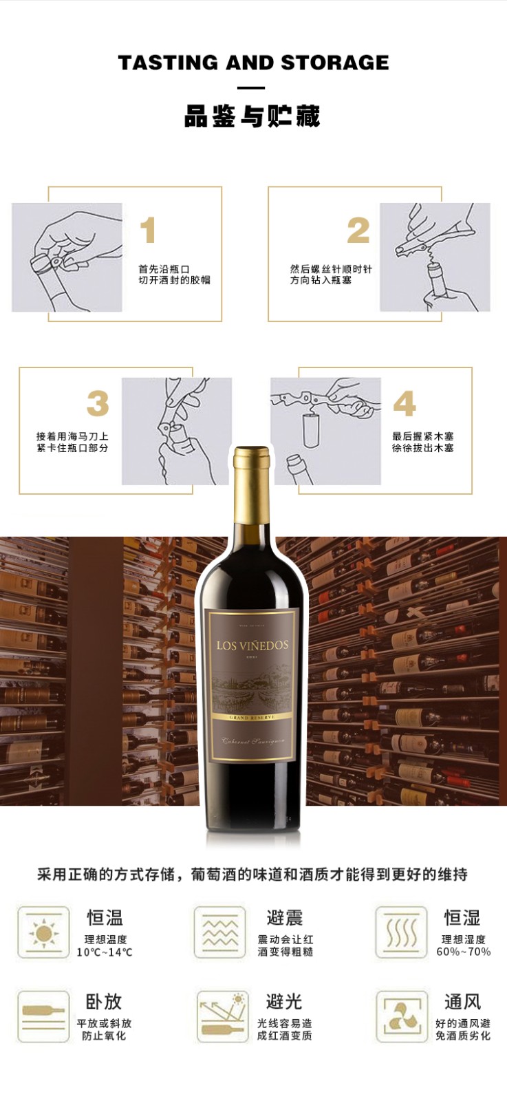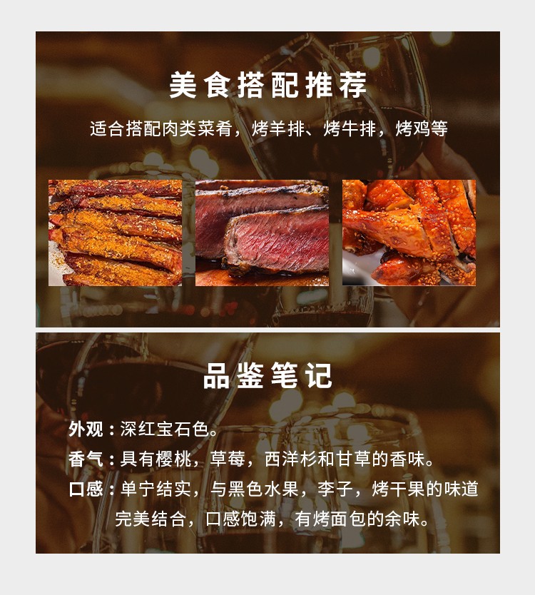 口感:单宁结实,与黑色水果、李子、烤干果的味道完美结合,口感饱满,有烤面包的余味。