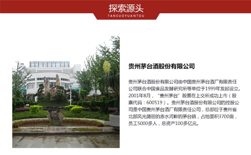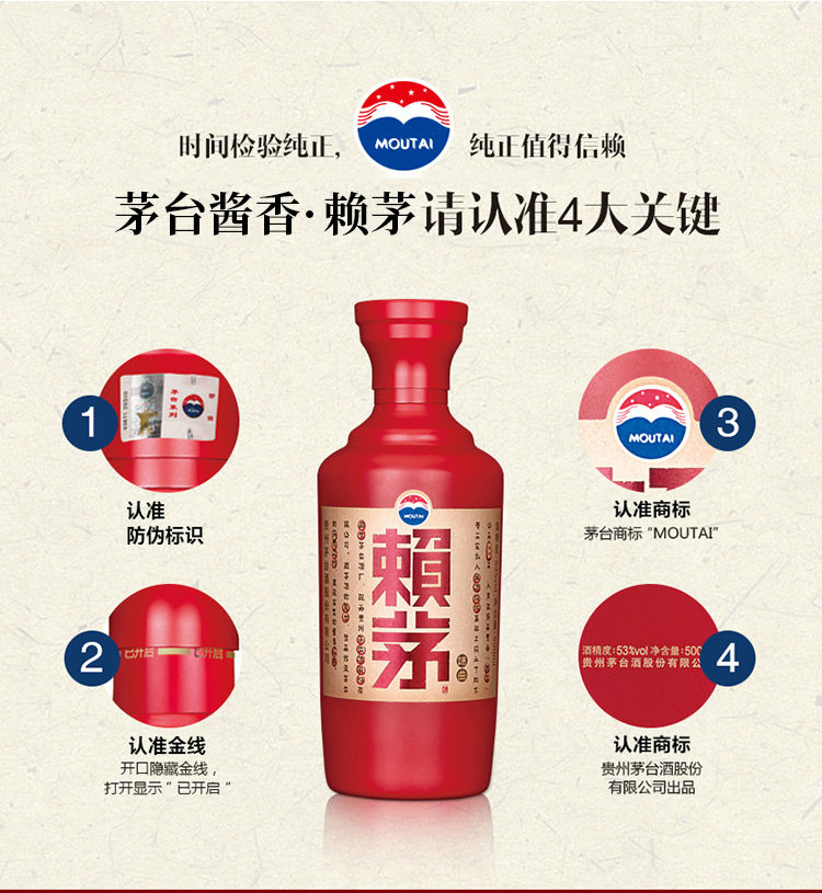 采用茅台酒的传统酱香工艺酿造,精选优质高粱、小麦和水为原料,。其主要工艺流程包括:端午踩曲、制曲、发酵、蒸馏、陈酿、勾兑、包装。瓶身整体色调采用大红色,设计风格不变,承赖茅系列经典模样。