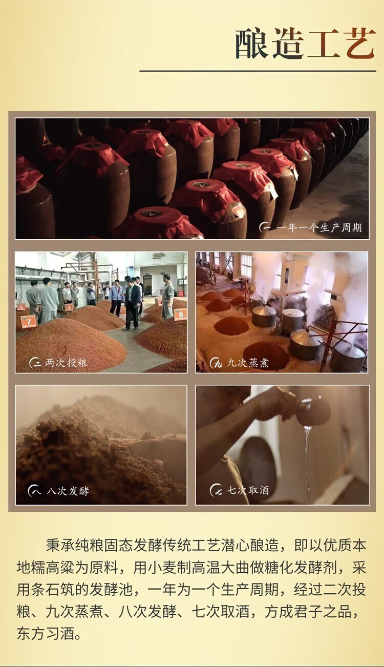 秉承中国酱酒的传统酿造工艺,采用纯粮固态酿造。精选优质本地糯高梁、小麦为原料,采用条石筑的发酵池,一年为一个生产周期,经过二次投粮、九次蒸煮、八次发酵、七次取酒,通过高温制曲、堆积、发酵、流酒和长期贮存的特殊工艺精致而成。