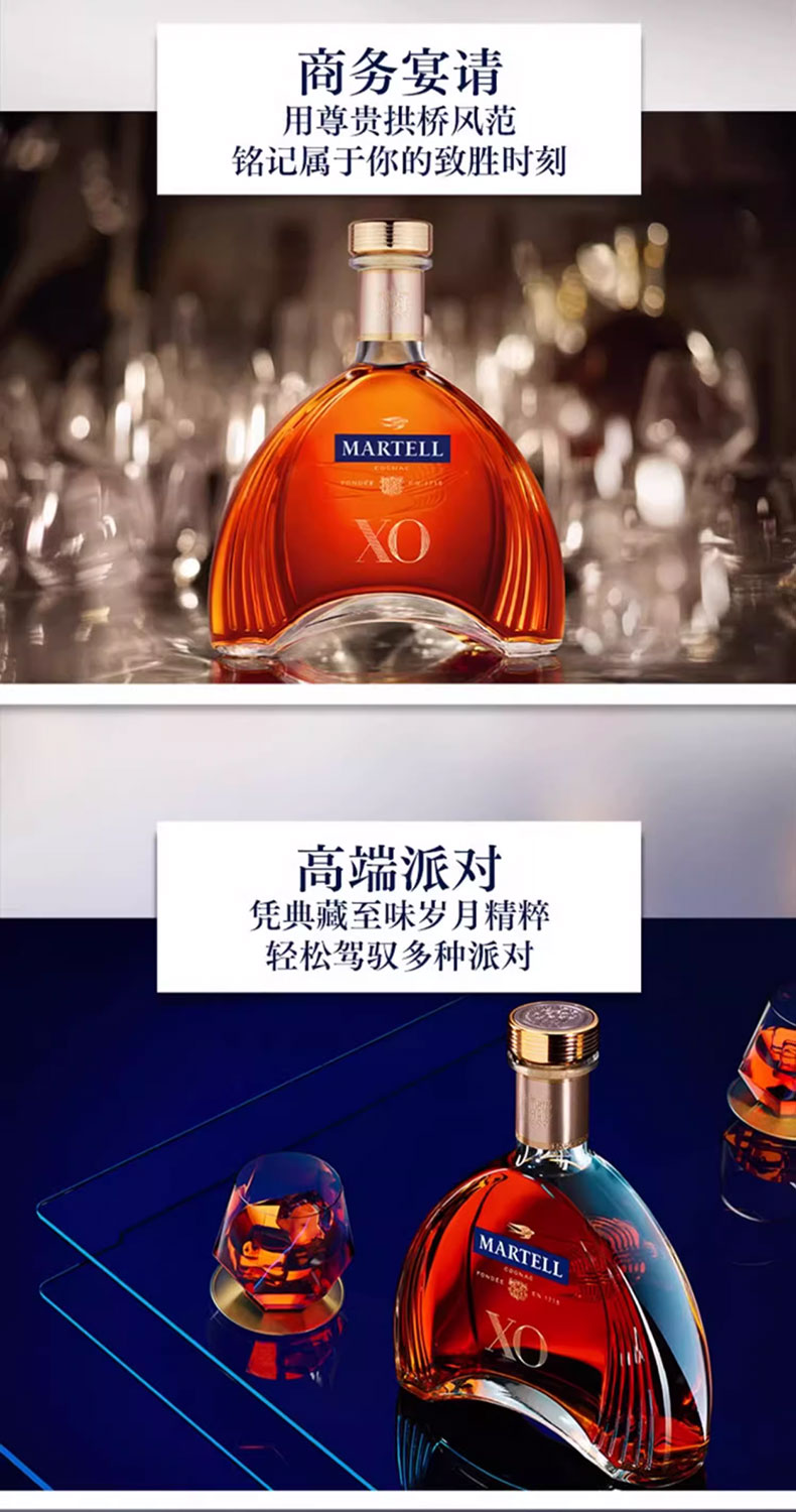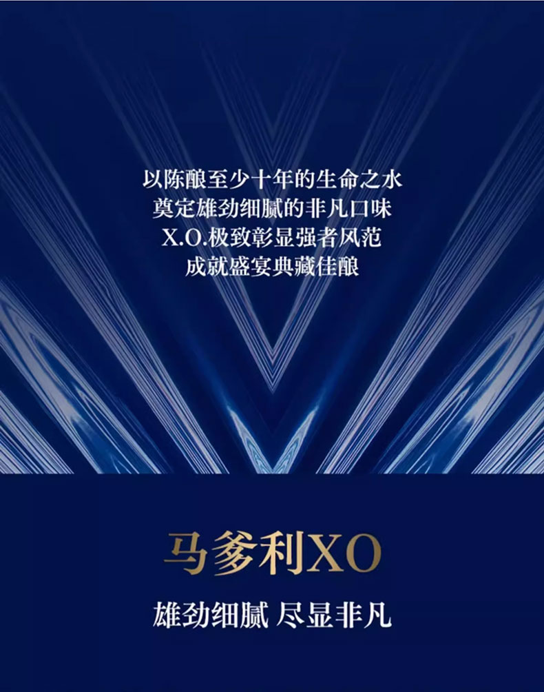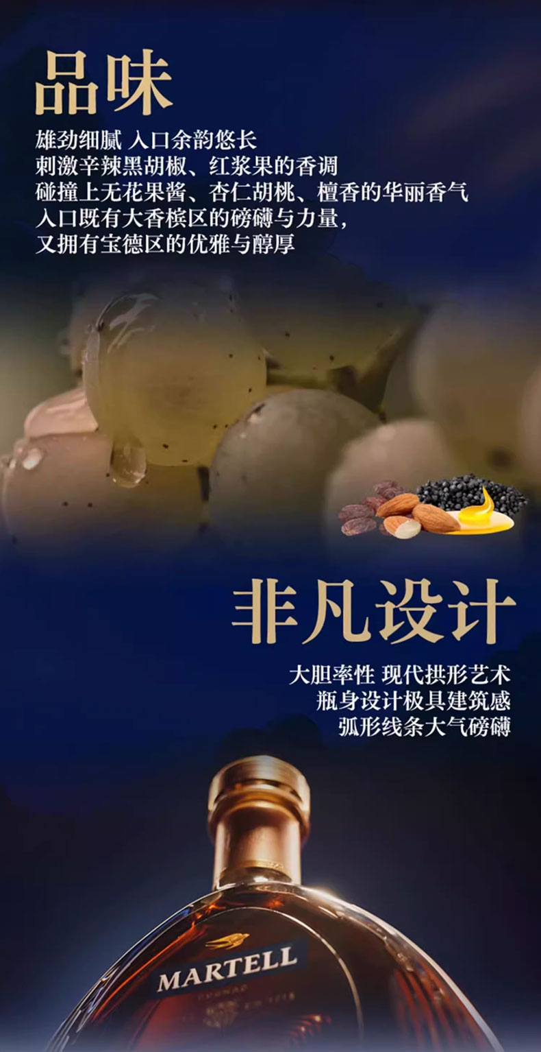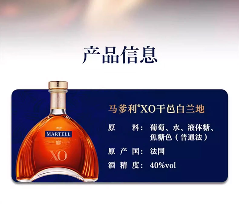 马爹利是法国保乐利加集团出品。严格遵循传统的酿造工艺。具有浓郁而复杂的口感,余味悠长,留香持久。拱形艺术瓶身是睿智与灵感的象征。适合名媛聚会、高端派对、商务宴请、礼赠等场合。
