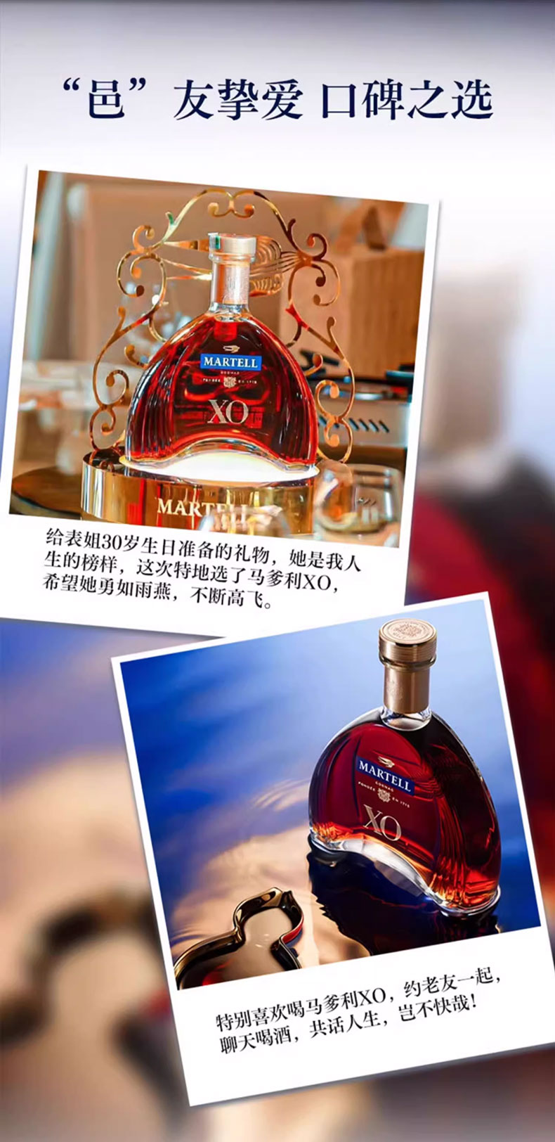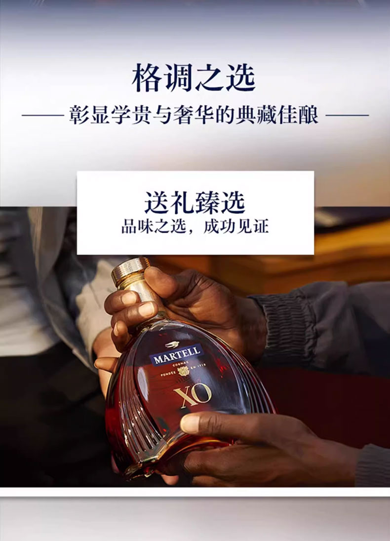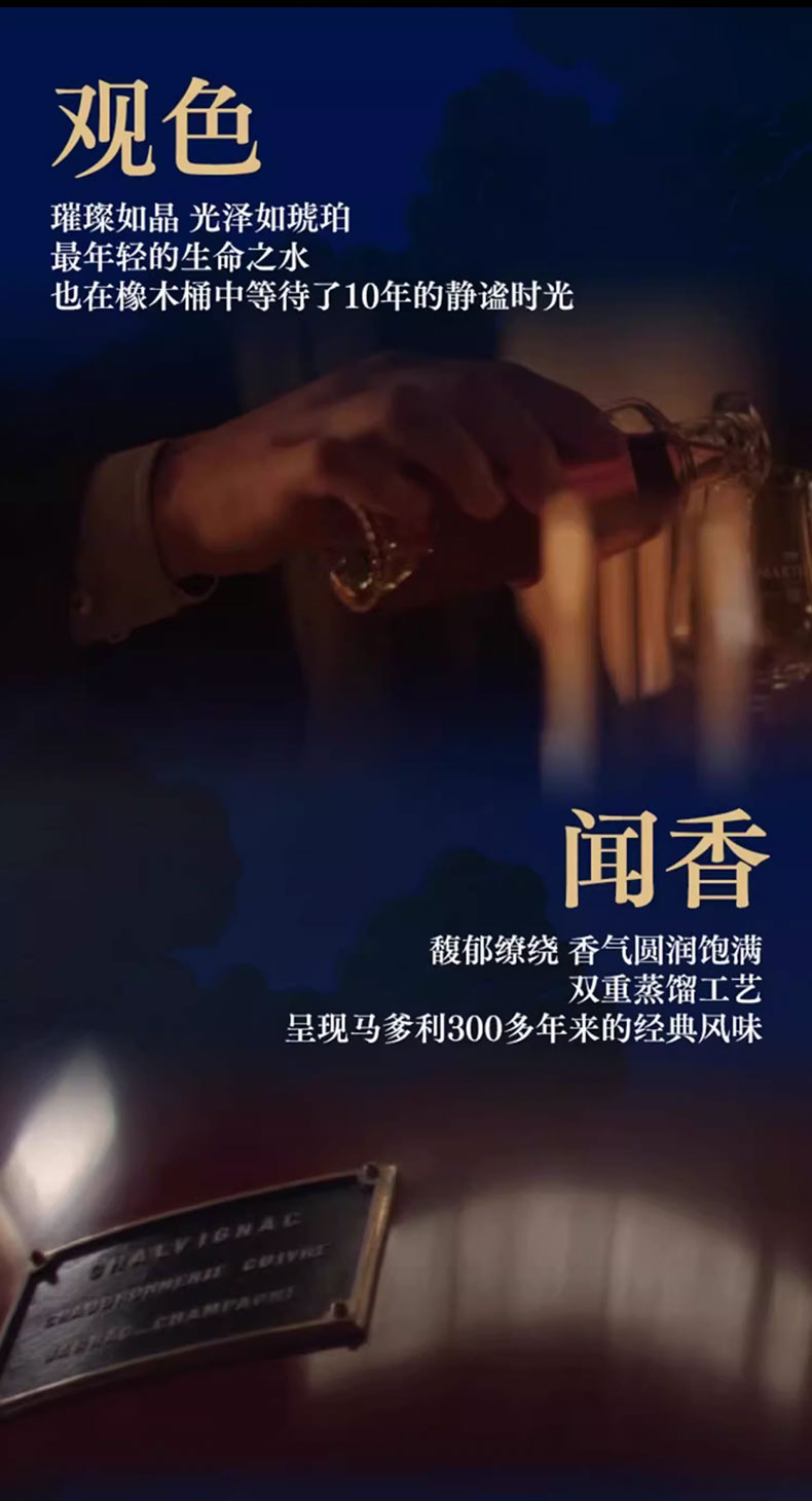 马爹利是法国保乐利加集团出品。严格遵循传统的酿造工艺。具有浓郁而复杂的口感,余味悠长,留香持久。拱形艺术瓶身是睿智与灵感的象征。适合名媛聚会、高端派对、商务宴请、礼赠等场合。