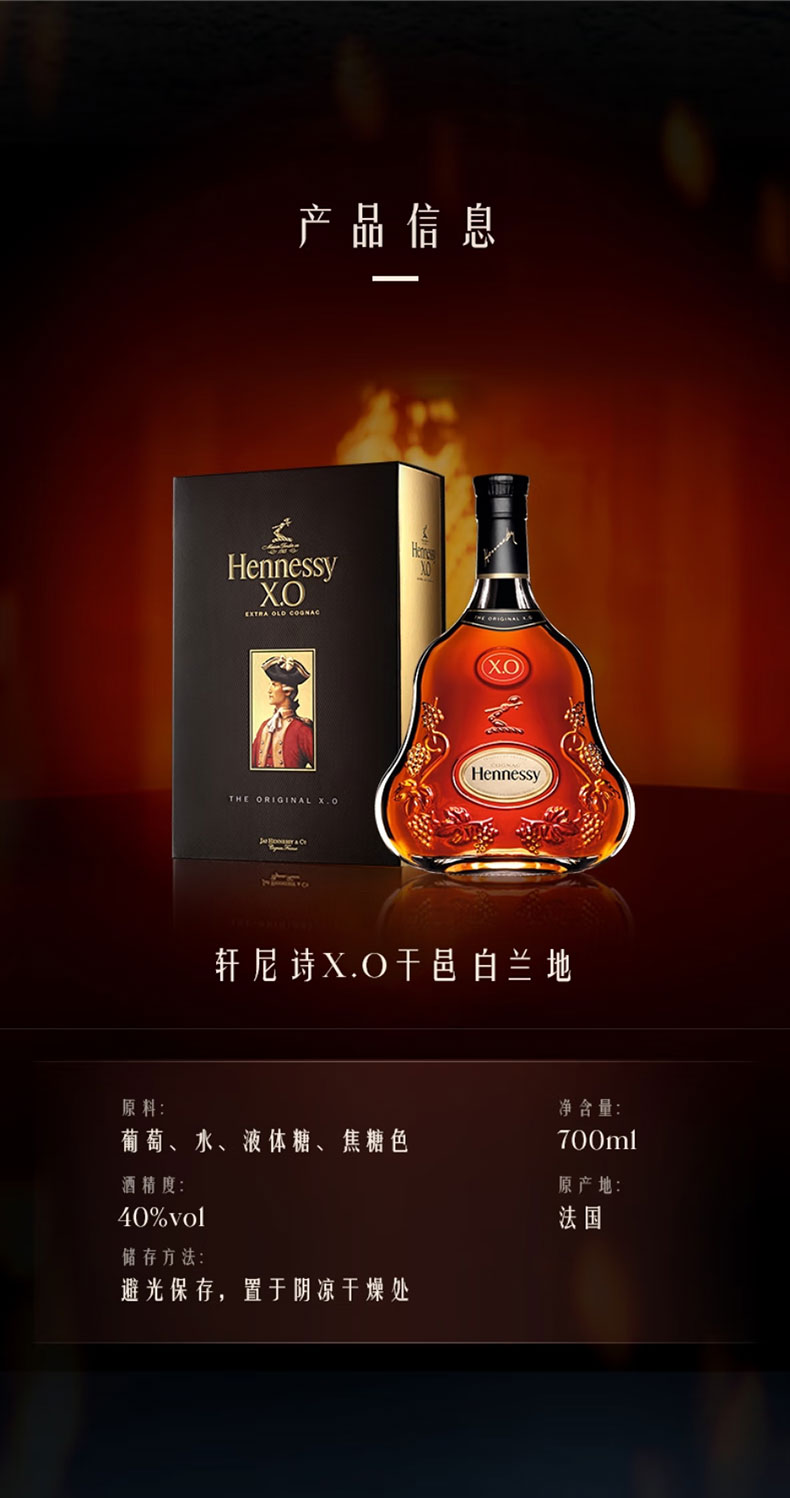 轩尼诗是法国LVMH集团出品。严格遵循传统的酿造工艺。散发着强烈而独特的芳香,醇厚圆润,余味悠长。是商务接待、宴请、礼赠的不二选择。