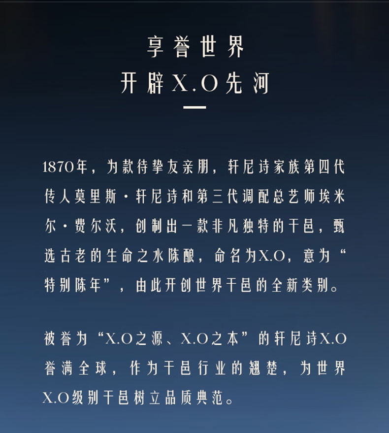 轩尼诗是法国LVMH集团出品,1765年由理查德▪轩尼诗创立,生产地位于法国干邑地区。