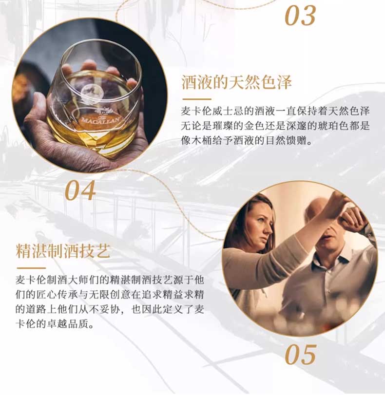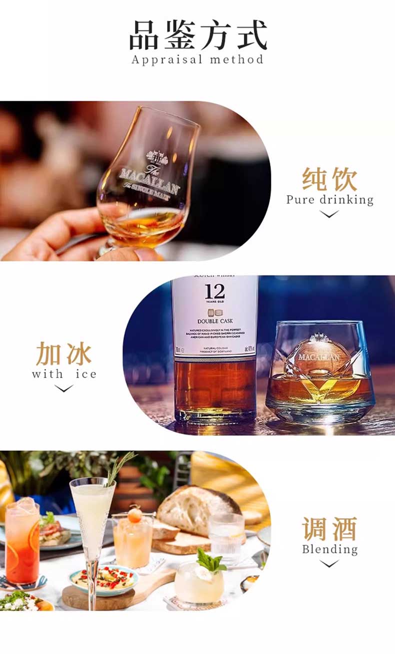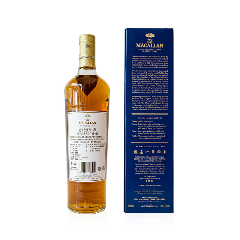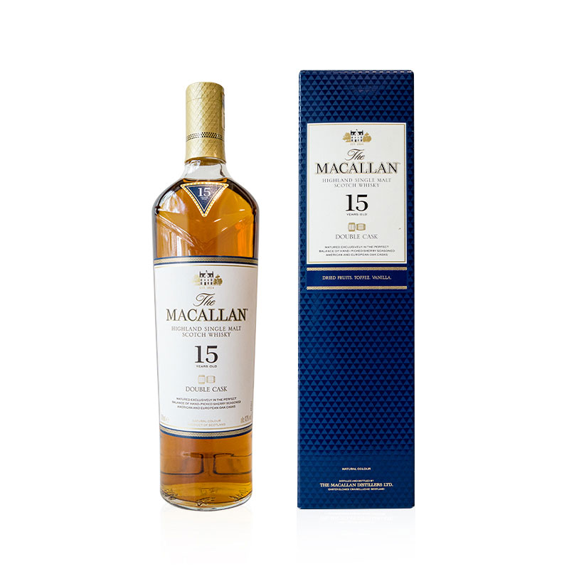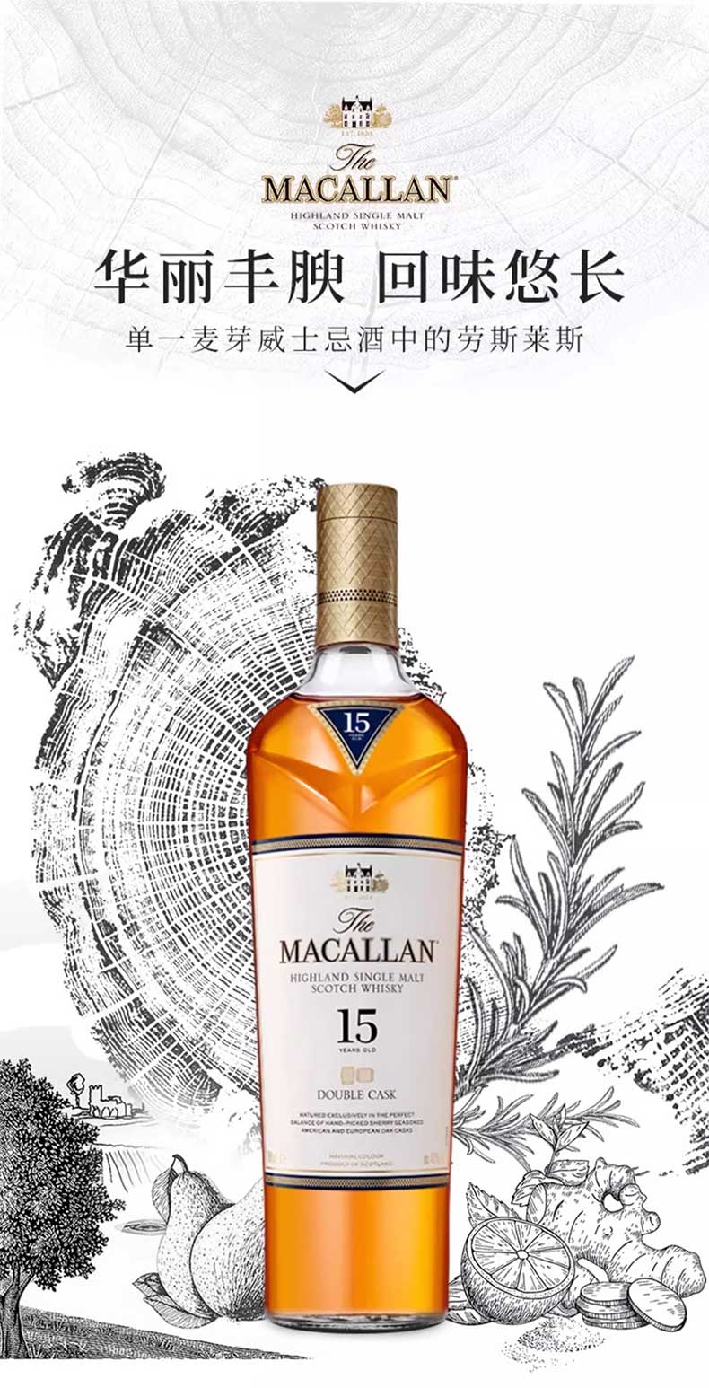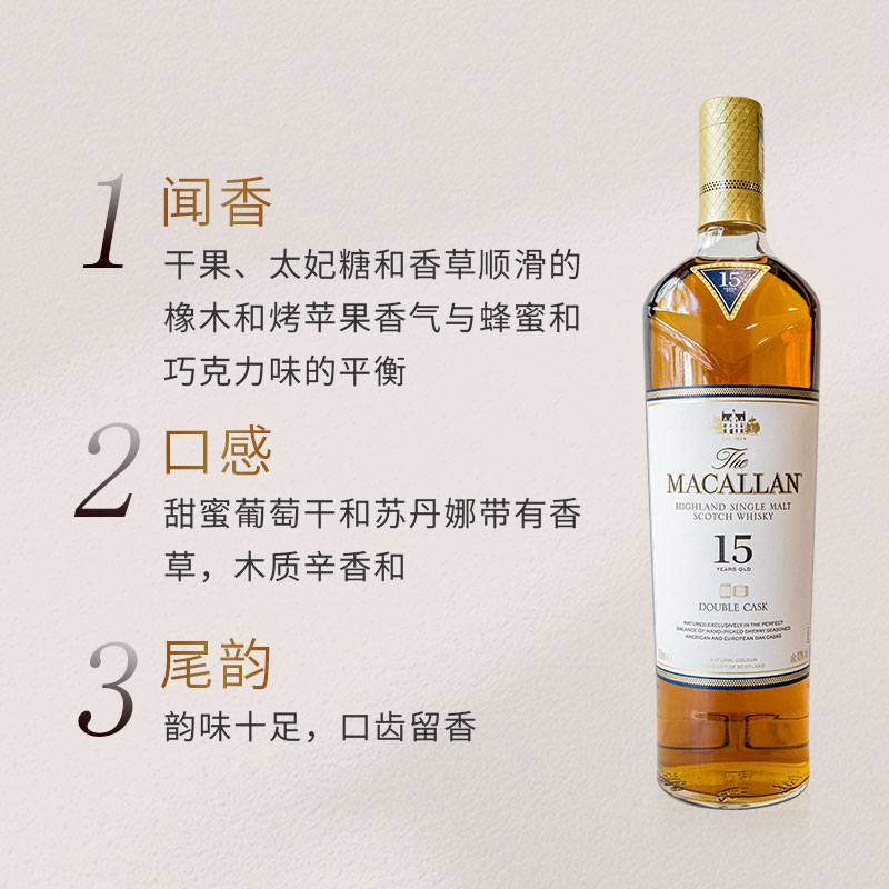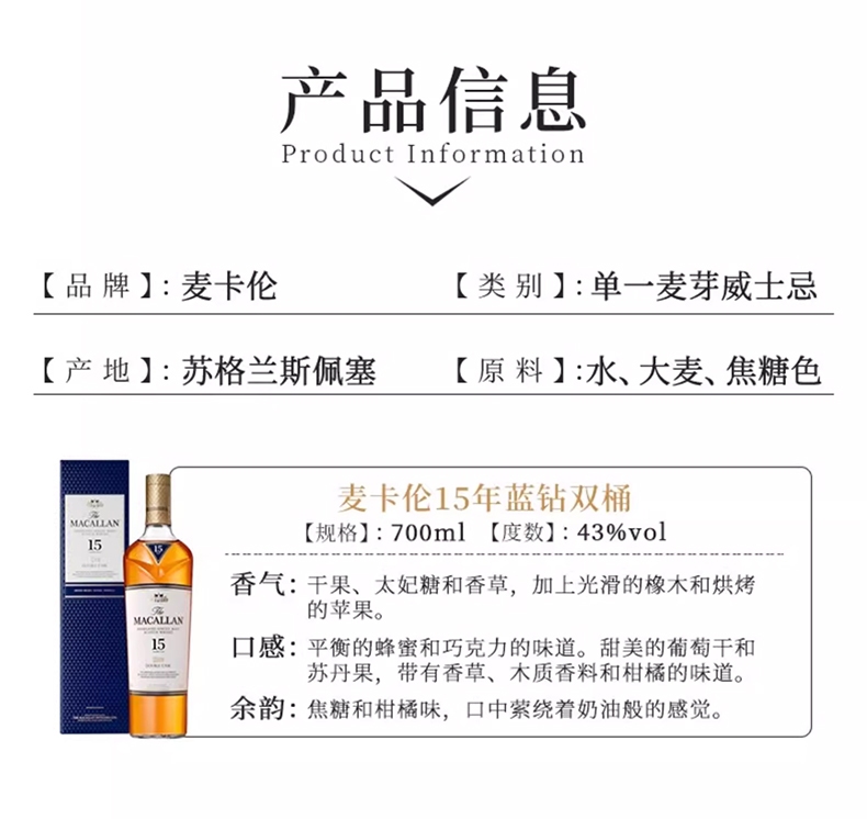 22麦卡伦蓝钻15年双桶是麦卡伦酒厂出品,口中充盈着香甜的葡萄干、香草、肉桂以及柑橘类水果芬芳,姜味、焦糖味、柑橘味、口感绵长而滑腻。是商务接待、宴请、礼赠的不二选择。