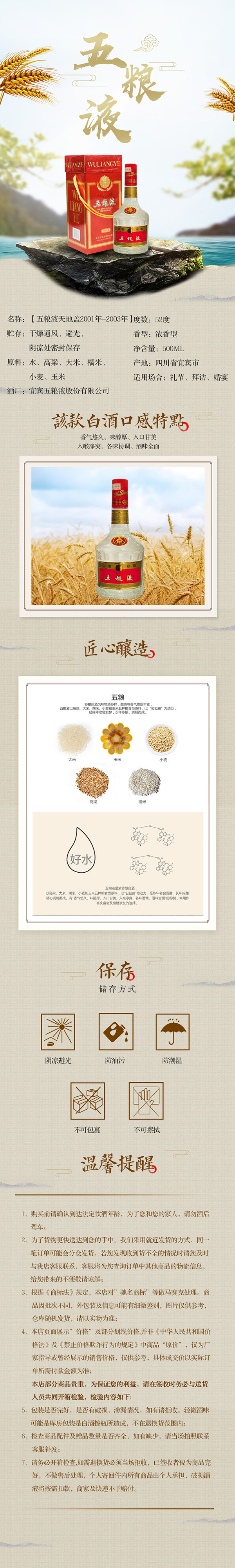 五粮液(天地盖)是宜宾五粮液股份有限公司出品。从95年开始,五粮液开始使用‘多楞天地盖’。天地盖指的是外包装盒盖,纸盒的盖为‘天’,底为地故称天地盖,五粮液将第五代红色长城图案纸盒,改称金卡纸天地盖包装,这一时期的酒瓶发生变化,瓶身棱角较多,俗称‘多楞瓶’。天地盖加上多楞瓶的搭配,成就了第六代经典款的五粮液。