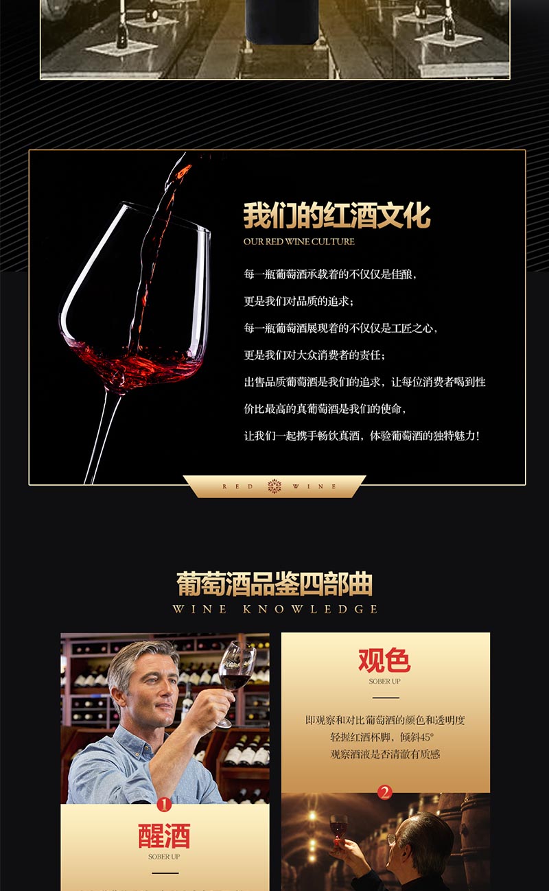 口感:入口丰满圆润、具有迷人的花香、红樱桃气息、以及咖啡和黑巧克力的味道、成熟的单宁带来多汁和甜美的口感