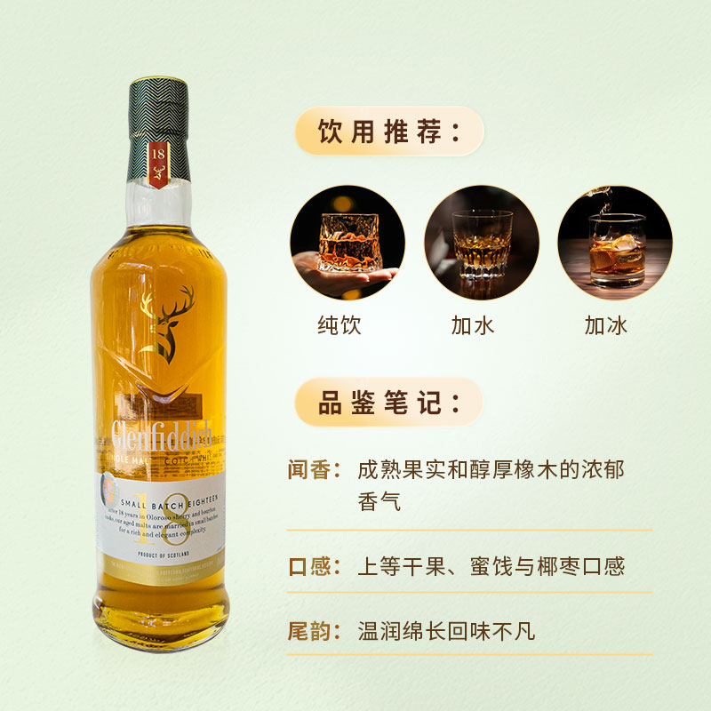 22年格兰菲迪18年是格兰父子国际有限公司出品,格兰菲迪是苏格兰最古兰的家族经营威士忌酒厂之一,创立于1887年,格兰菲迪以其优秀的单一麦芽威士忌而闻名,这款酒属于缓慢熟化于欧罗洛索雪莉桶和波本桶中至少18年,在小批量混合桶中熟成,从而得到口感柔顺丰富,醇香浓郁的单一麦芽苏格兰威士忌。