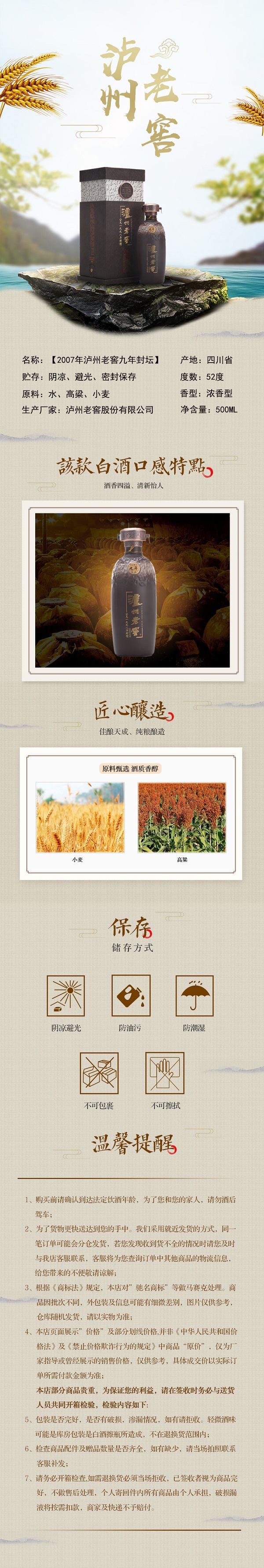 色泽微黄,绵甜柔和,醇厚丰满,窖香与陈味突出,层次丰富,余味悠长。