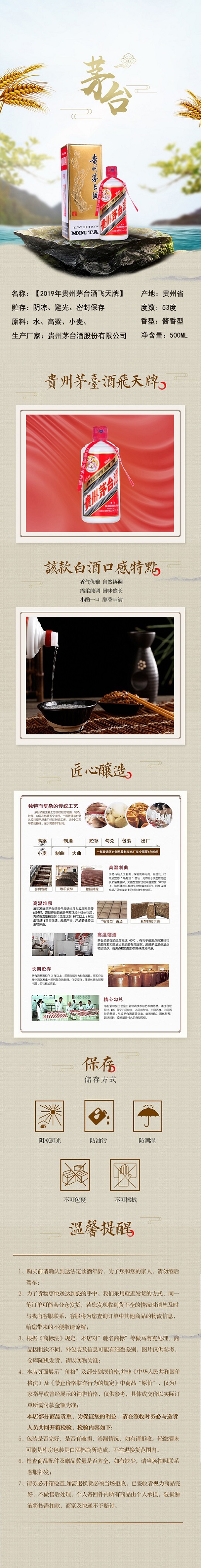 采用茅台酒传统工艺酿造,一瓶茅台酒从投料到出厂需要五年时间,历经制曲、制酒、贮存、勾兑、包装等5大工艺过程其酿制技艺入选国家非物质文化遗产茅台酒的生产始终坚持12987工艺和三高(高温制曲、高温堆积、高温馏酒)的工艺,陶坛长期贮存,以酒勾酒等传统工艺手法。
