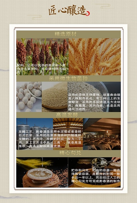 采用传统酱香型酿造工艺。经清蒸续渣,加曲堆积,石窖发酵,蒸馏摘酒,贮存陈酿,勾兑调味等工序酿成。